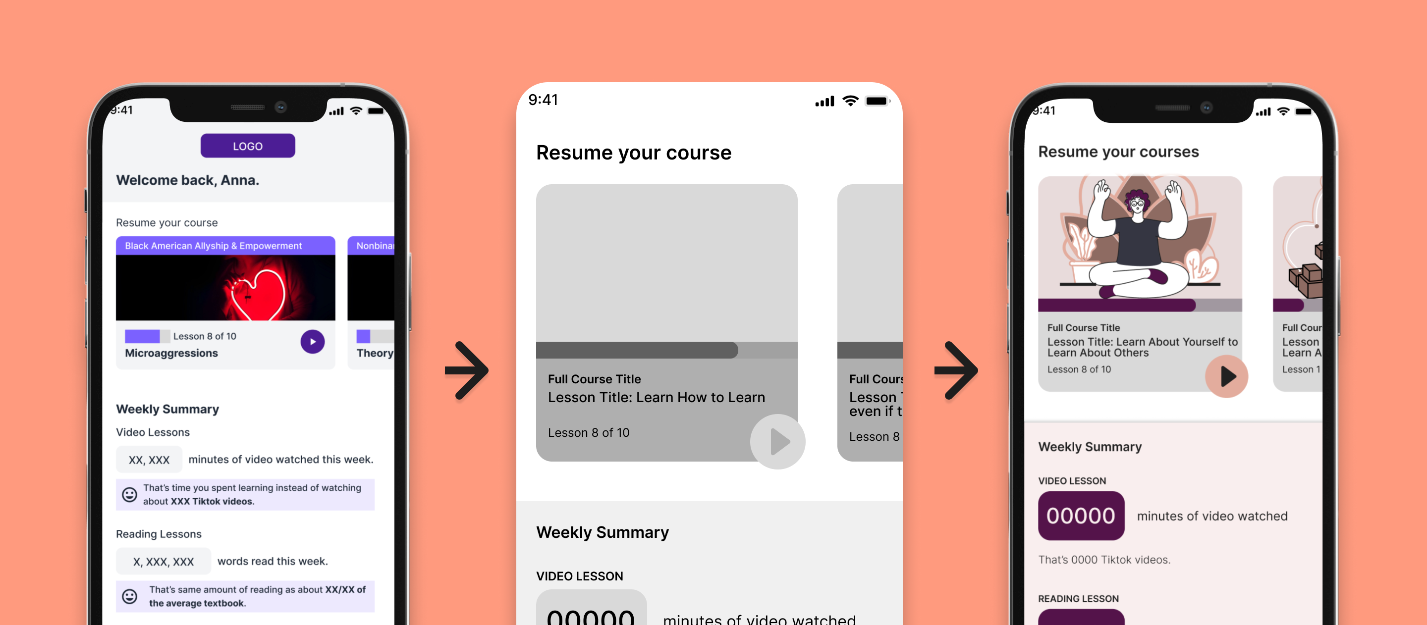 - Since users value feelings of growth, I included an upfront progression bar to encourage learners to engage and complete lesson content